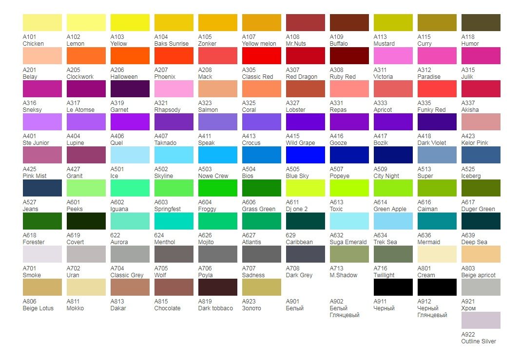 Названия цветов:  Baby; Bios; Bozik; Buffalo; Chicken; Clockwork Crew; Cornflower; Covert; Crocus; Granit; Iceberg; Jeans; Le Atomse; Mack; Menthol; Mermaid; Military Shadow; Peeks; Phoenix; Pumpkin; Rhapsody; Salmon; Smoothie; Speak; Suga Emerald; Super; Toxic; Vanila; Бежевый Beige Apricot; Бежевый Beige Lotus; Бежевый Dakar; Бежевый Mokko; Белый Super; Белый White; Белый глянцевый White Gloss; Бледно-розовый Kelor Pink; Бронза Bronze; Голубой Blue Sky; Горчичный Mustard; Гранат Garnet; Желтый Baks Sunrise; Желтый DJ one 2; Желтый Yellow Cadmium; Желтый Yellow Melon; Желтый Zonker 207; Зеленая трава Grass Green; Зеленое яблоко Green Apple; Зеленый Cannabis; Зеленый Froggy; Золото Gold; Истинно-зеленый True Green; Коралловый Coral; Коричневый Macadamia; Коричневый Mr. Nuts; Красно-коричневый Horse; Красно-коричневый Ruby Red; Красный Classic Red; Маджента Akisha; Медь Cooper; Ментол White; Мохито Mojito; Небесно-голубой Skyline; Оранжево-красный Funky Red; Оранжевый Halloween; Оранжевый Lobster; Пастельно-оранжевый Belay; Розовый Julik; Розовый Paradise; Розовый Pink Mist; Розовый Princess; Светло-голубой Ice; Светло-зеленый Caterpillar; Светло-розовый Repas; Светло-серый Smoke; Светло-серый Wolf 745; Серо-зеленый Twilight; Серый Asphalt; Серый Classic Grey; Серый Poyla; Серый Sadness 748; Синий City Night; Синий NoWe Crew; Синий Popeye the sailor; Сиреневый Lupine; Телесный Cream 110; Темно-желтый Curry; Темно-зеленый Caribbean; Темно-зеленый Deep Sea; Темно-зеленый Forester 620; Темно-коричневый Dark Tobacco; Темно-красный Red Dragon; Темно-серый Grey dark; Утренняя заря Aurora; Фиолетовый Dark Violet; Фиолетовый Taknado; Фиолетовый Wild Grape; Фуксия Sneksy; Хаки Humor; Хром; Черный Black; Черный глянцевый Black Gloss; Шоколад Chocolate; Ярко-голубой Trek Sea Breez; Ярко-зеленый Atlantis, компьютерная колеровка по согласованию.