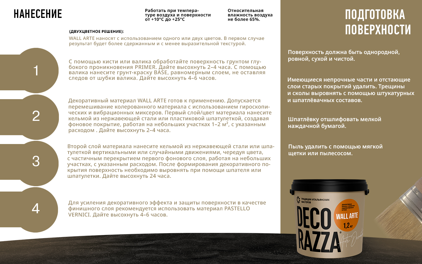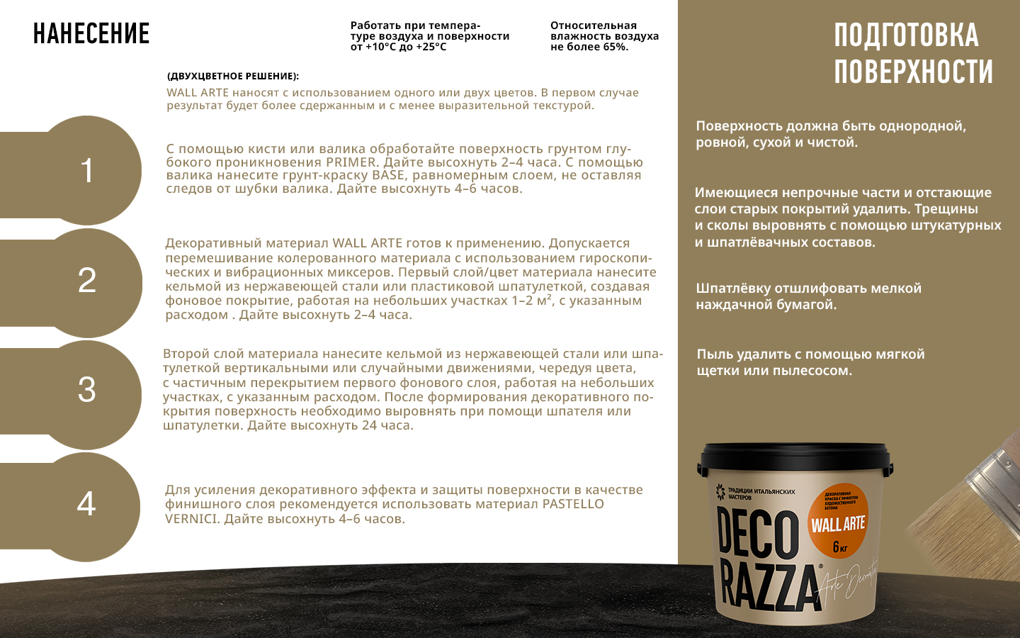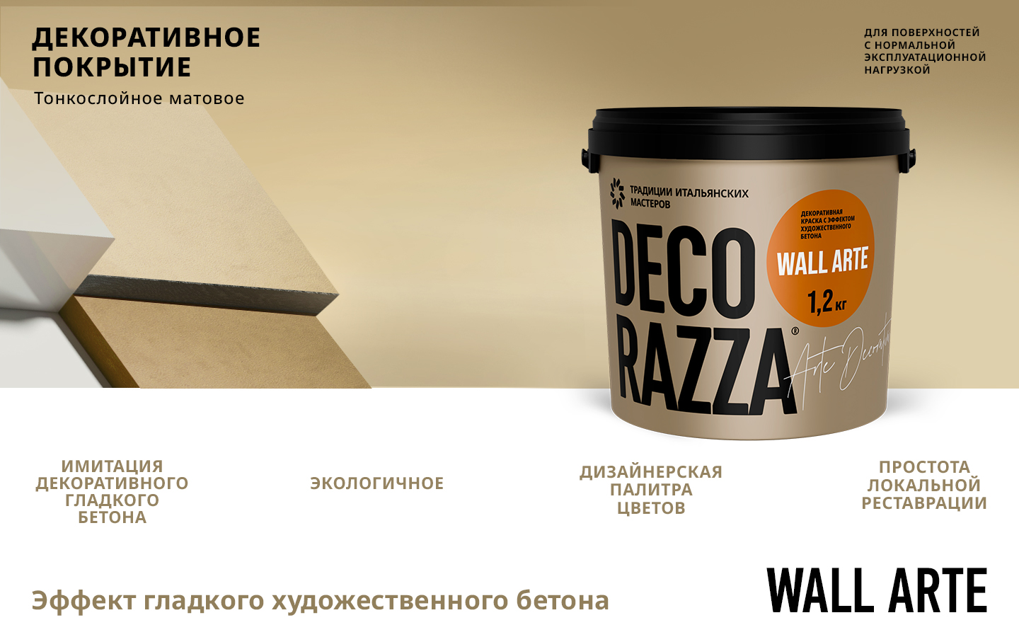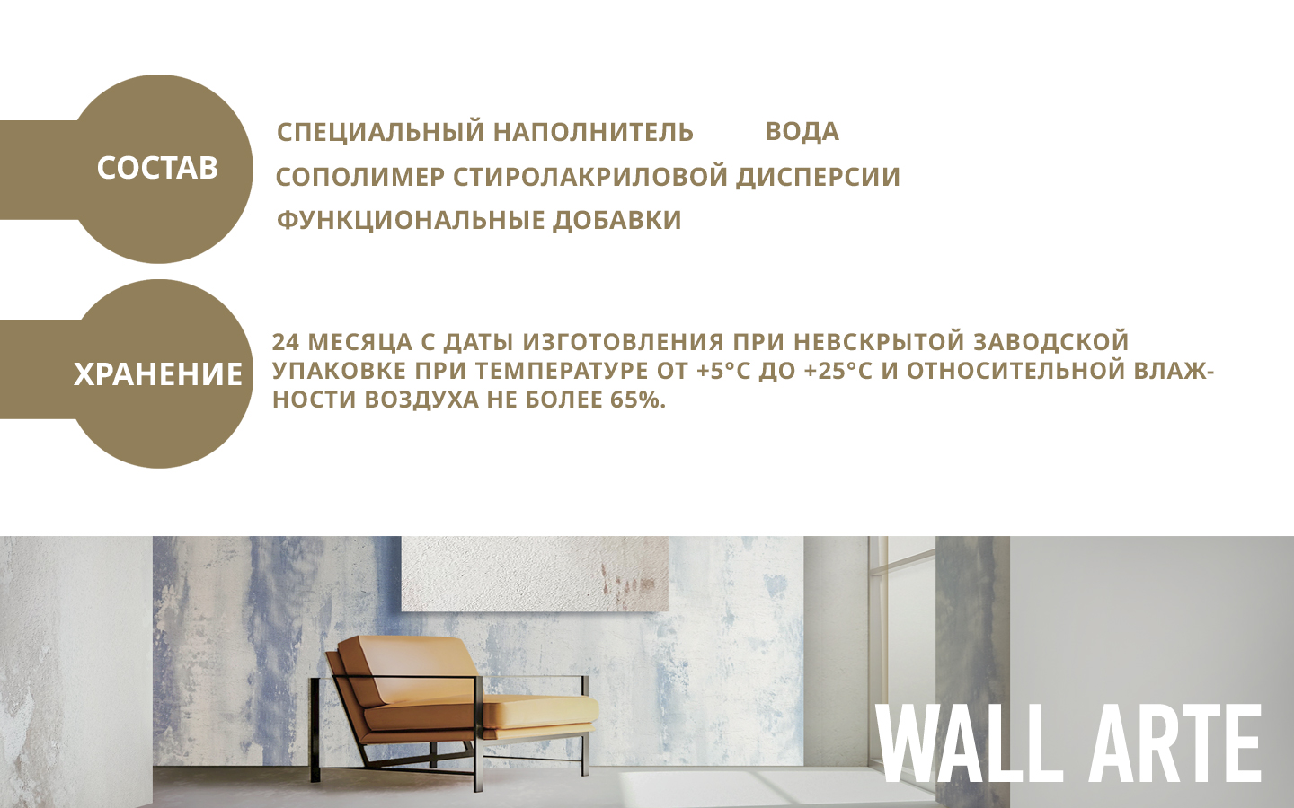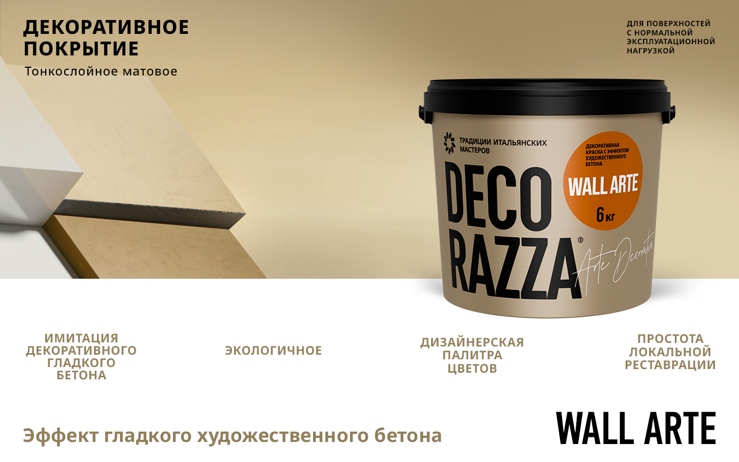 Декоративное покрытие с эффектом бетона WALL ARTE  -  Декоративное покрытие DECORAZZA WALL ARTE Откройте дверь в мир современного интерьера с помощью декоративного покрытия DECORAZZA WALL ARТЕ — идеального решения для стиля ЛОФТ. Это премиальное покрытие создает уникальный эффект бетона, добавляя вашему пространству изысканную фактурность и глубину. Благодаря своей высококачественной структуре, оно легко трансформирует стены, делая их центром внимания и подчеркивая индивидуальный вкус владельца. DECORAZZA WALL ARТЕ идеально подходит для создания атмосферных и стильных интерьеров, где каждый элемент важен и уникален. Применяйте его в жилых пространствах, офисах или кафе, чтобы придать дизайну современный, но в то же время урбанистический и теплый оттенок. Это покрытие не требует сложных навыков в нанесении и обеспечивает долговечность и устойчивость к износу, обеспечивая элегантный вид вашего помещения на долгие годы. от бренда Decorazza с доставкой по России!