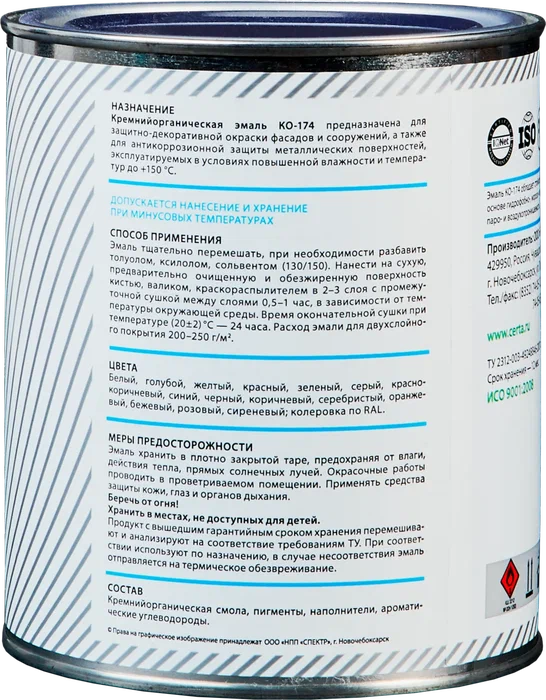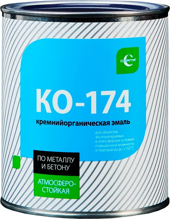 - Cиликоновая (или другими словами кремнийорганическая) основа эмали КО-174 CERTA позволяет ей называться фасадной и использоваться для антикоррозионной защиты металла, бетона, штукатурки, кирпича.