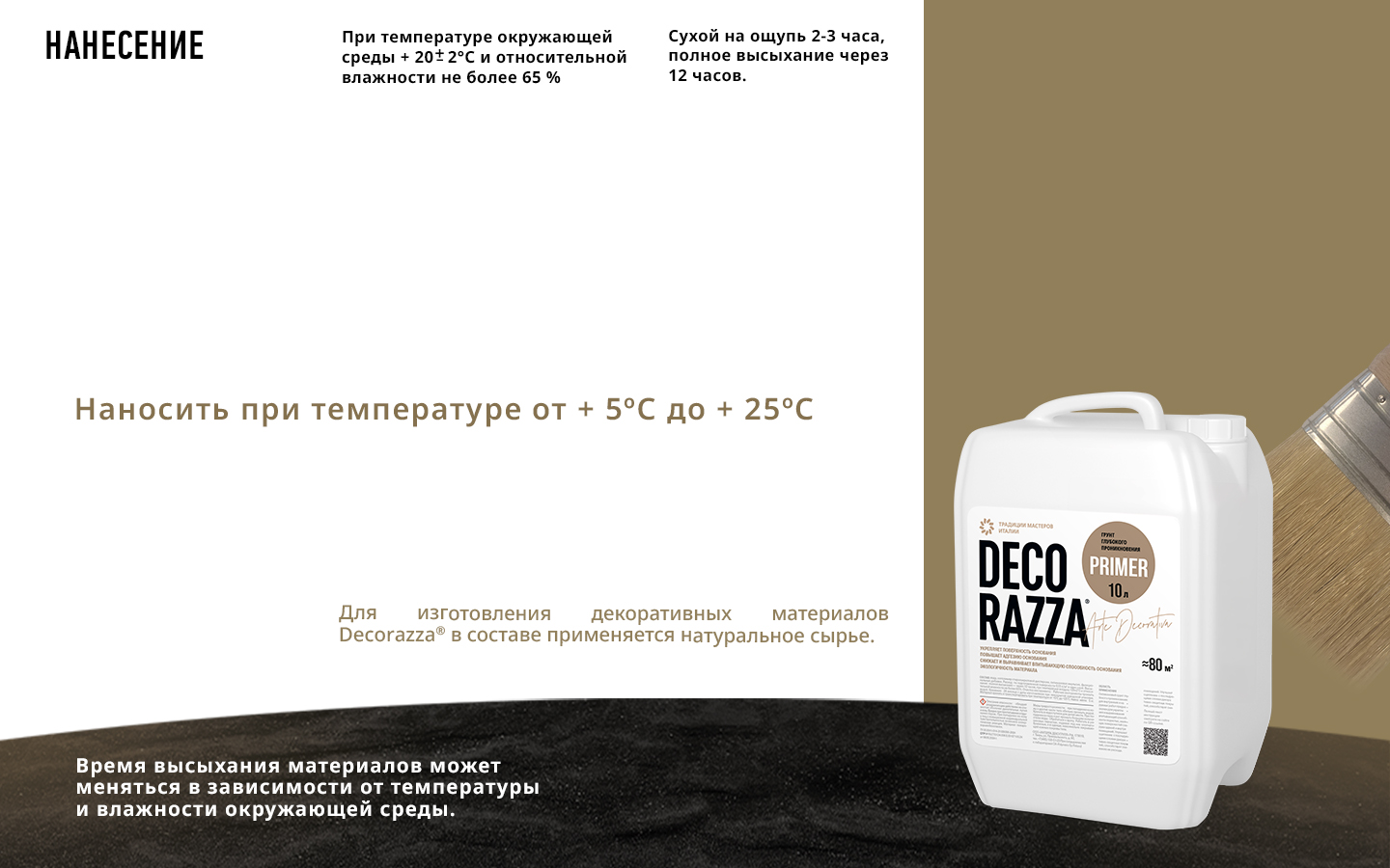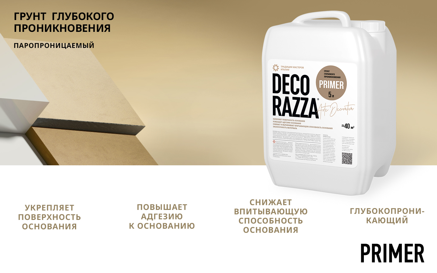 Грунт глубокого проникновения PRIMER  -  Грунт Decorazza PRIMER — это высококачественная акриловая грунтовка, специально разработанная для минеральных поверхностей, таких как бетон, кирпич и штукатурка. Этот грунт обладает уникальной способностью глубокого проникновения, обеспечивая надежное сцепление с основанием и значительно повышая адгезию декоративной краски или покрытия. Decorazza PRIMER отличается от других грунтов отсутствием неприятного запаха, что делает его идеальным выбором для помещений, где важна комфортная атмосфера. Его укрепляющие свойства обеспечивают долговечность и прочность отделки, делая поверхность устойчивой к механическим воздействиям и погодным условиям. Этот грунт идеально подходит для подготовки основания перед нанесением декоративных покрытий, обеспечивая безупречную гладкость и однородность цвета. Decorazza PRIMER гарантирует качественную основу для любых декоративных работ, делая их долговечными и эстетичными. от бренда Decorazza с доставкой по России!