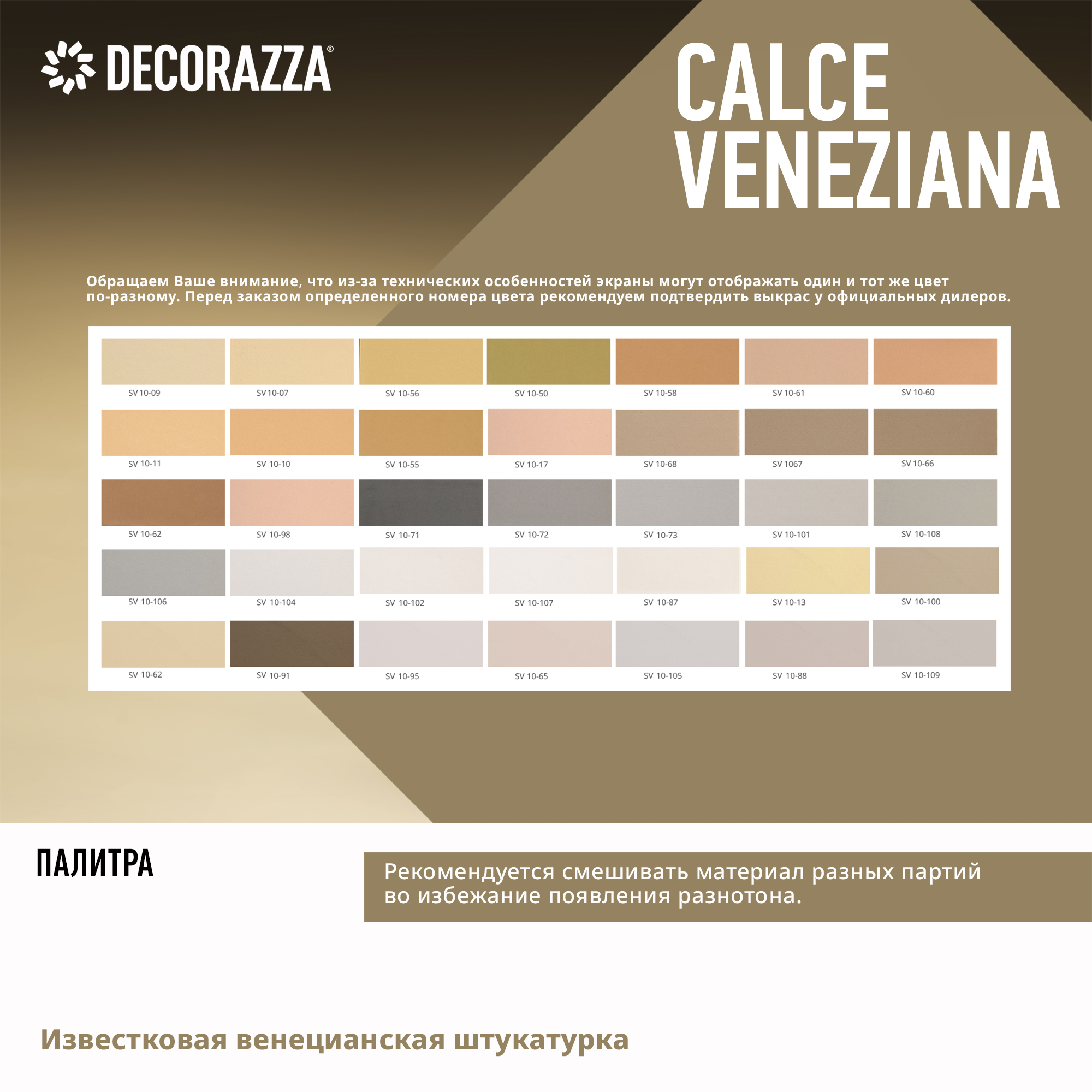 Колеровка: Колеровка материала осуществляется пигментными пастами, компьютерным способом, по каталогу Stucco Veneziano (ограниченное количество цветов). Покрытия на известковой основе обладают высокой щелочностью (pH 10-12), из-за этого некоторые пигменты теряют свою красящую способность и могут изменять оттенок, поэтому при колеровке необходимо использовать стойкие к высокому рН пигменты. Также не рекомендуется хранить колерованный материал более 14 суток, это может привести к незначительному изменению оттенка материала. Добавлять не более 5% пигментов.