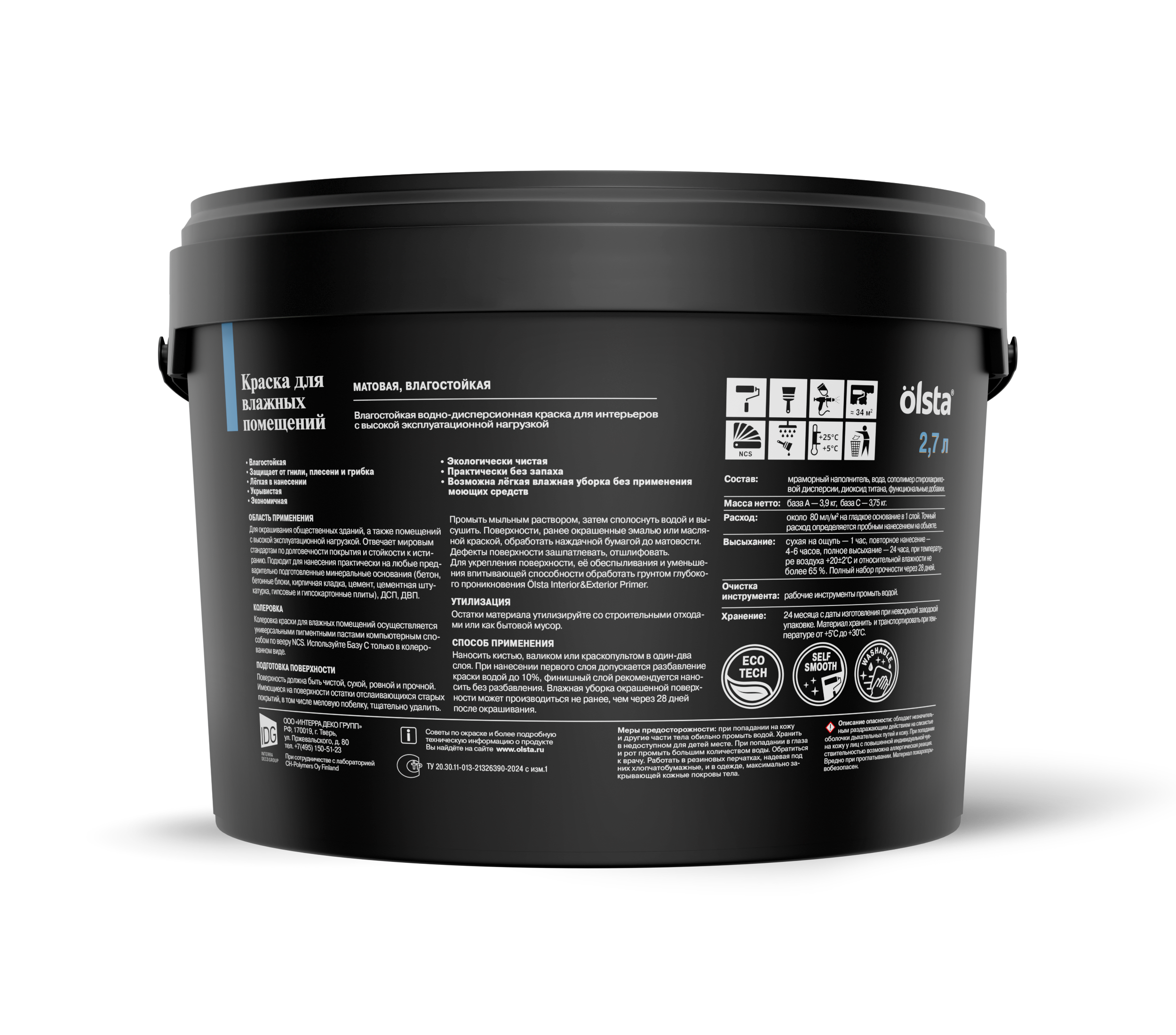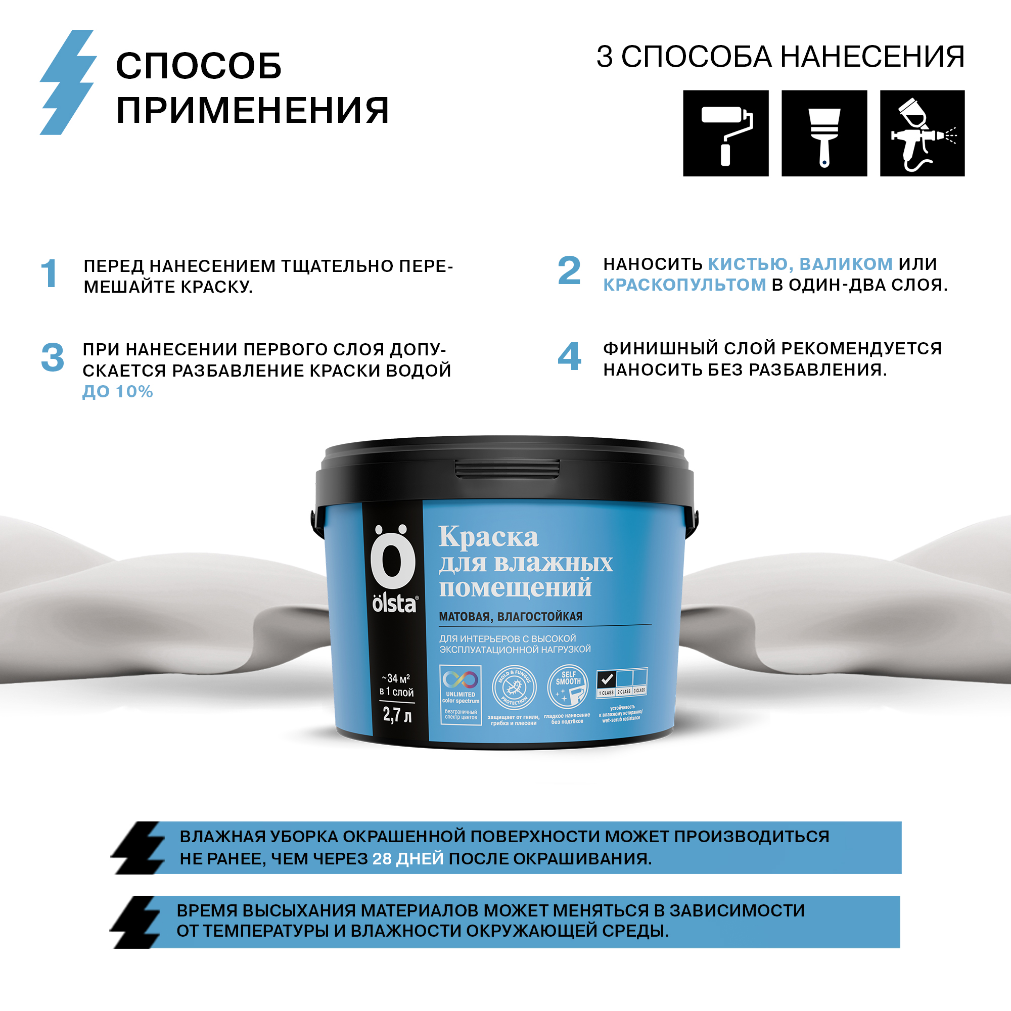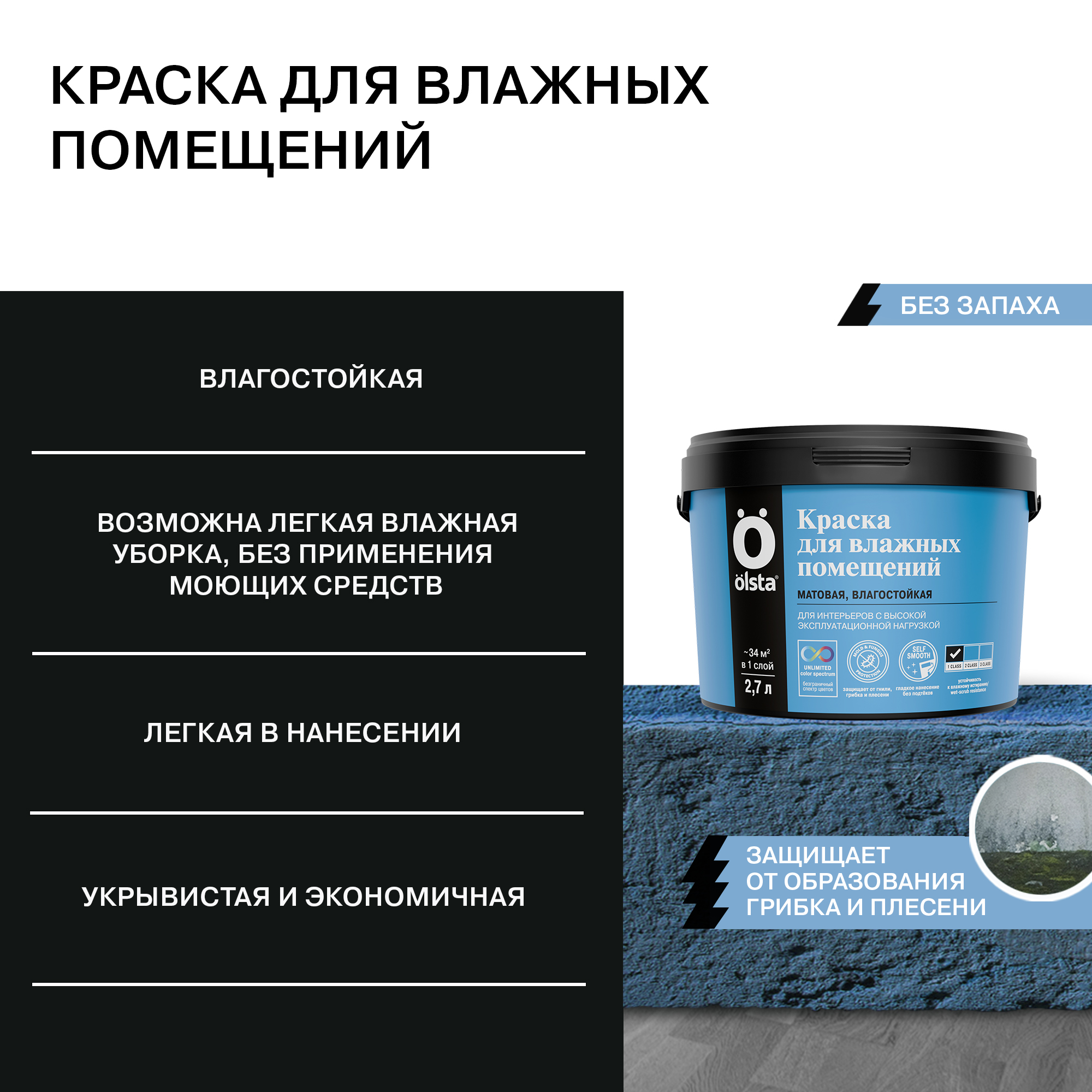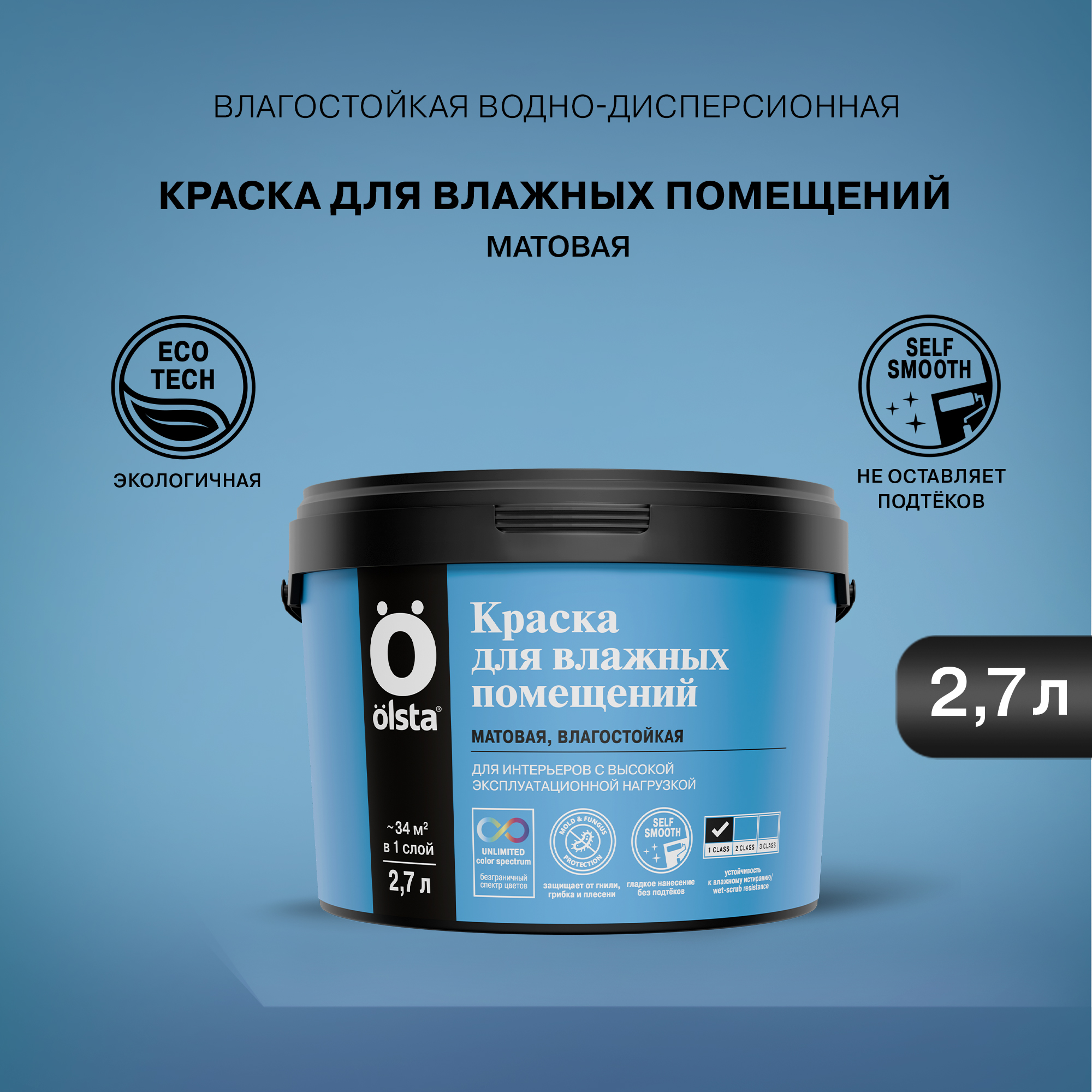 Краска для влажных помещений - Краска для окрашивания общественных зданий, а также помещений с высокой эксплуатационной нагрузкой. Отвечает мировым стандартам по долговечности покрытия и стойкости к истиранию. Подходит для нанесения практически на любые предварительно подготовленные минеральные основания (бетон, бетонные блоки, кирпичная кладка, цемент, цементная штукатурка, гипсовые и гипсокартонные плиты), ДСП, ДВП. от бренда OLSTA с доставкой по России!