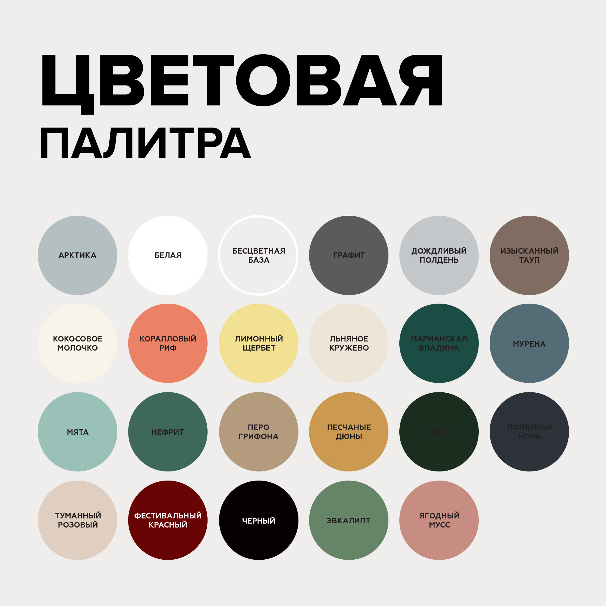 | Названия цветов: | Арктика; Белый; Графит; Дождливый полдень; Изысканный тауп; Кокосовое молочко; Коралловый риф; Лимонный щербет; Льняное кружево; Марианская впадина; Мурена; Мята; Нефрит; Основа C - для колеровки в насыщенные тона; Перо грифона; Песчаные дюны; Пихта; Полярная ночь; Туманный розовый; Фестивальный красный; Черный; Эвкалипт; Ягодный мусс , компьютерная колеровка по согласованию. |