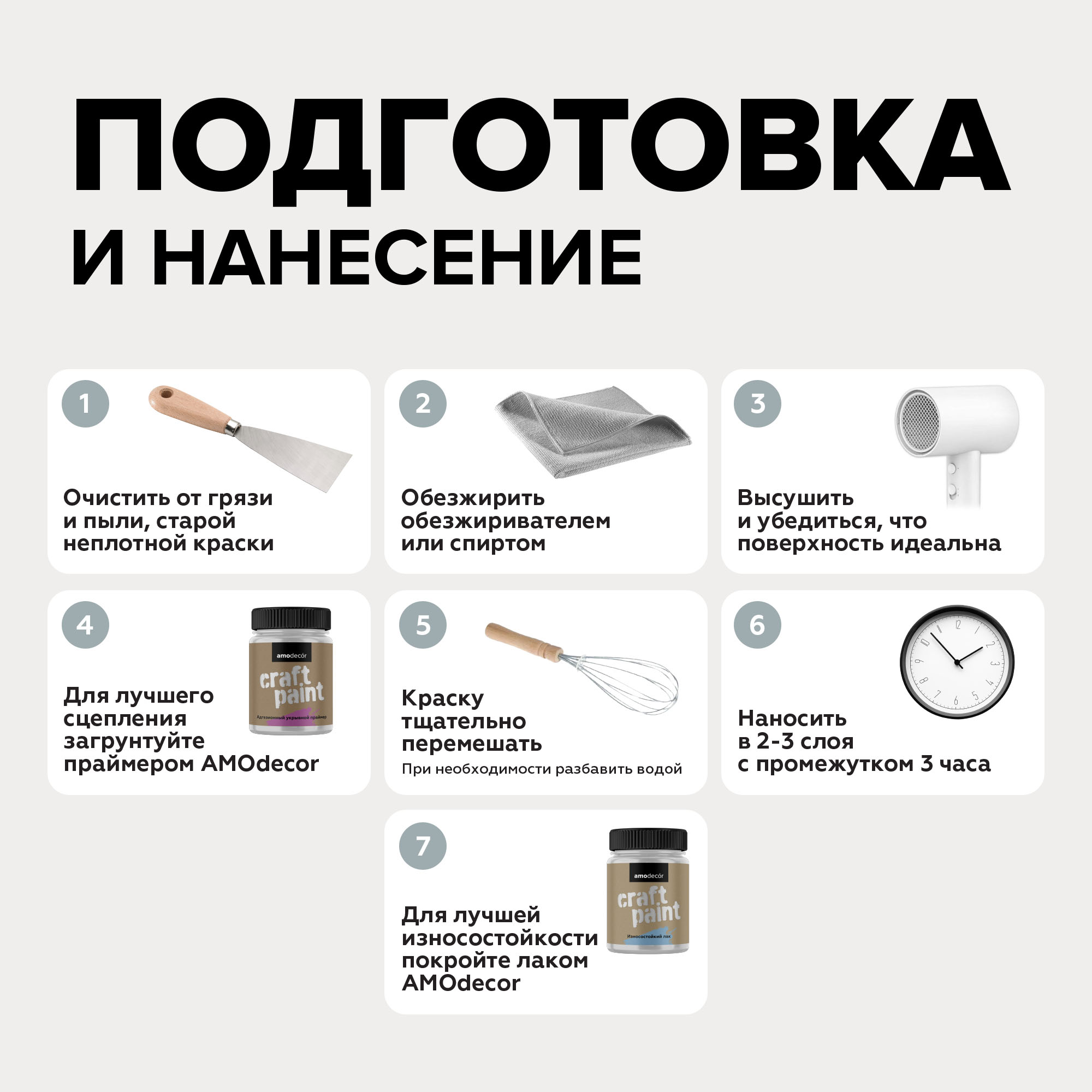 Меловая краска для мебели АМОdecor - Мебельная меловая краска АМОdecor — это идеальный выбор для создания уютного интерьера с акцентом на натуральность и экологичность. На водной основе, она отличается отсутствием запаха, что делает её идеальной для использования внутри помещений. Краска обладает матовой текстурой, которая добавляет мебели элегантность и глубину цвета. Благодаря своему составу, АМОdecor безопасна для здоровья и окружающей среды, обеспечивая долговечное покрытие, которое легко наносится и быстро высыхает. Её декоративные свойства позволяют преобразить любую мебель, добавляя индивидуальности и стиля в ваш дом. от бренда AMO с доставкой по России!