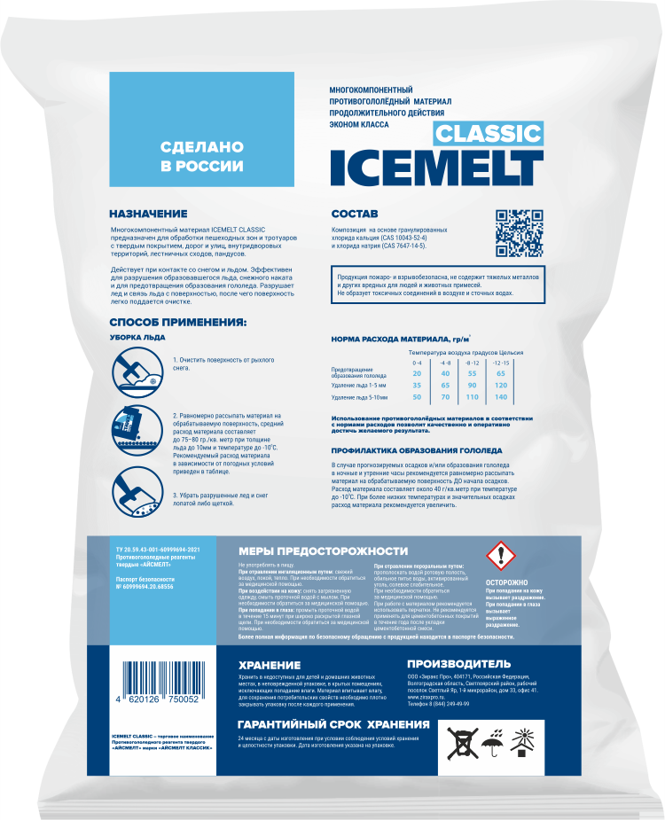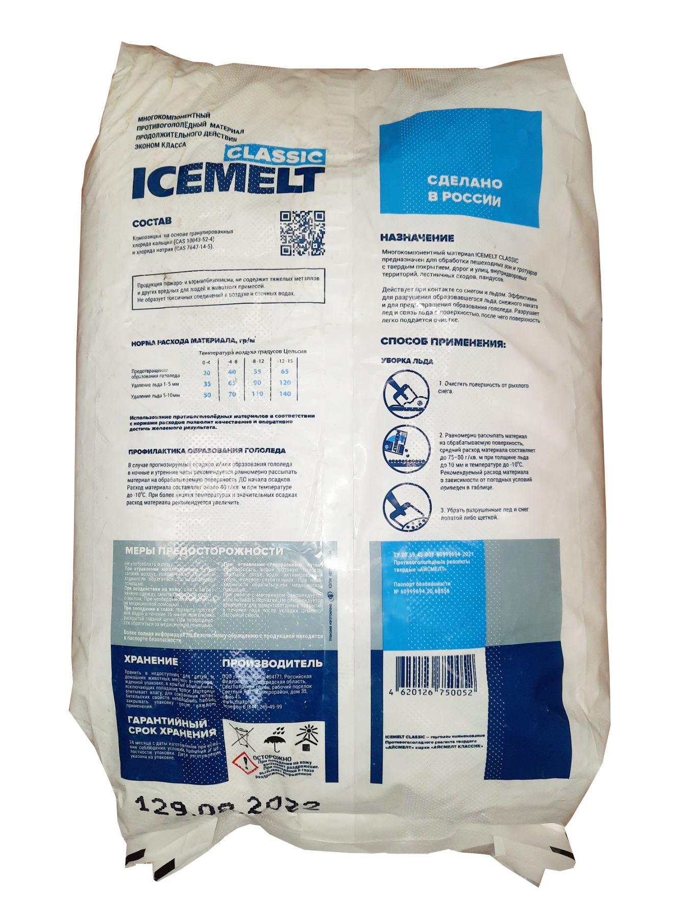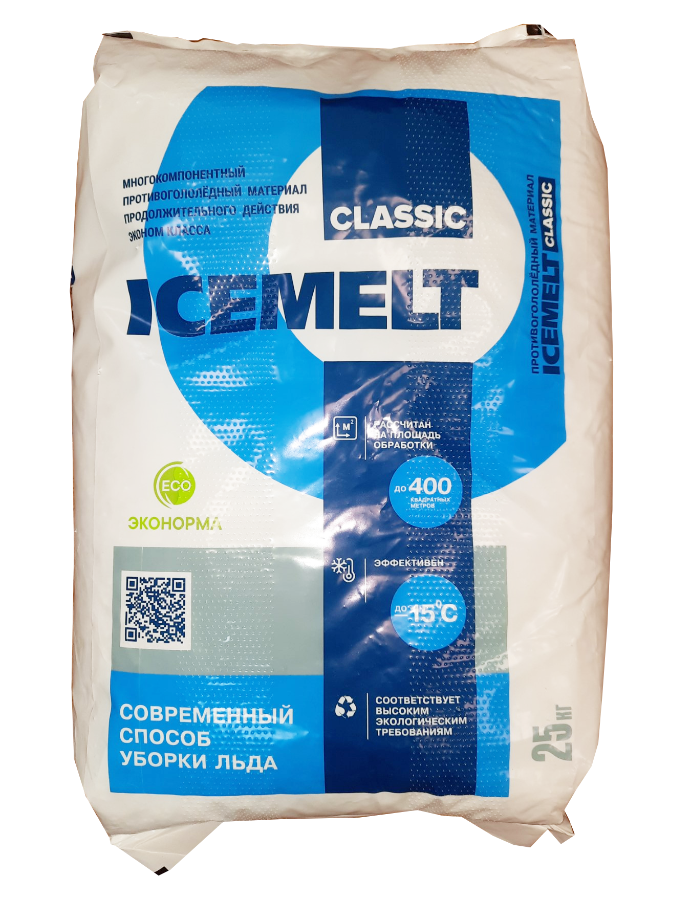Противогололедный материал ICEMELT (АЙСМЕЛТ) CLASSIC, предназначен для обработки пешеходных зон и тротуаров с твердым покрытием, дорог и улиц, внутридворовых территорий, лестничных сходов, пандусов.. Эффективен для разрушения образовавшегося льда, снежного наката и для предотвращения образования гололеда при температуре до – 15 оС . Разрушает лед и связь льда с поверхностью, после чего поверхность возможно легко очистить.