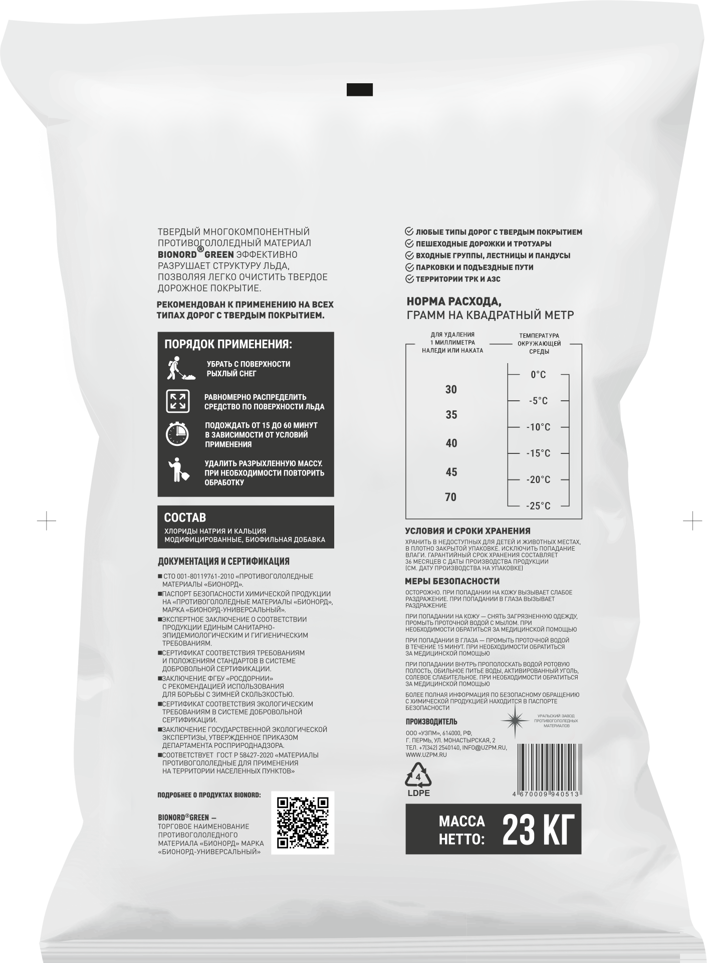 Противогололедный реагент Бионорд Грин -25 С  -  Средство для борьбы с гололедом. Экологически безопасен, сниженное воздействие на обувь, предотвращает разрушение дорожного покрытия. ПРОИЗВОДИТЕЛЬ: ООО «Уральский завод противогололедных материалов» https://uzpm.ru/ от бренда Бионорд с доставкой по России!